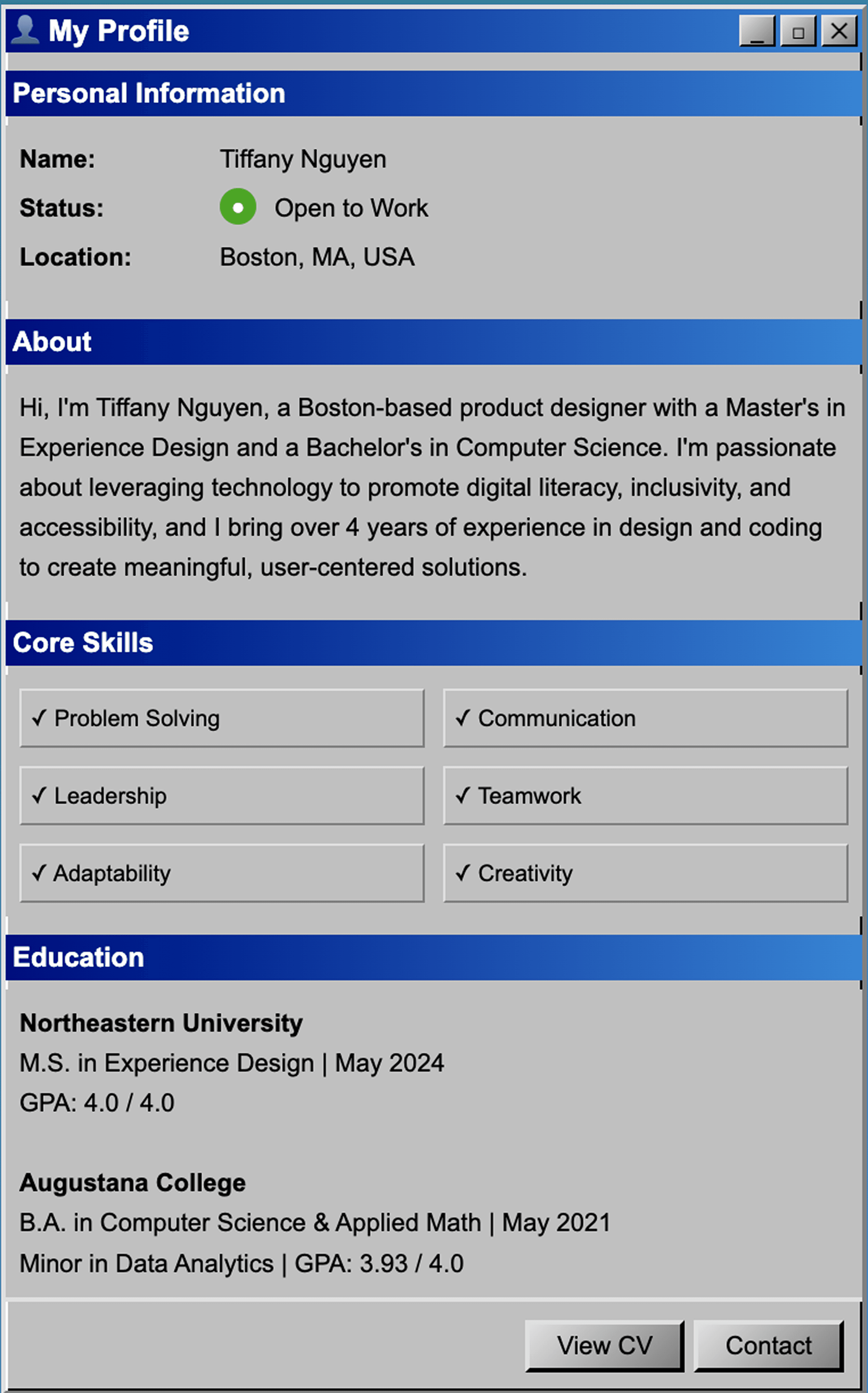 Hi there, I'm Tiffany Nguyen, a Boston-based product designer and aspiring PM. I grew up in the Dot-com era, when this nostalgic UI was still popular. ✌︎㋡