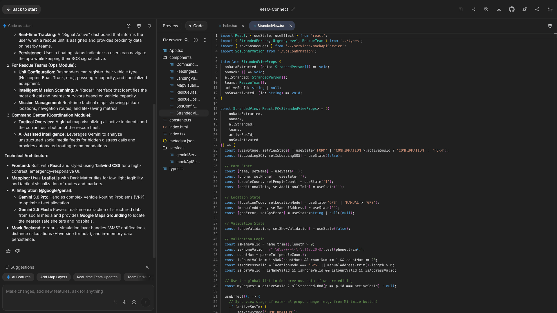 During the hackathon, AI Studio helped us build three complete user flows (stranded person, rescuer, command center) in a week. The speed was genuinely impressive. We'd describe a workflow, and within minutes, we had working UI components with state management and basic routing. This rapid iteration let us test ideas and pivot quickly.