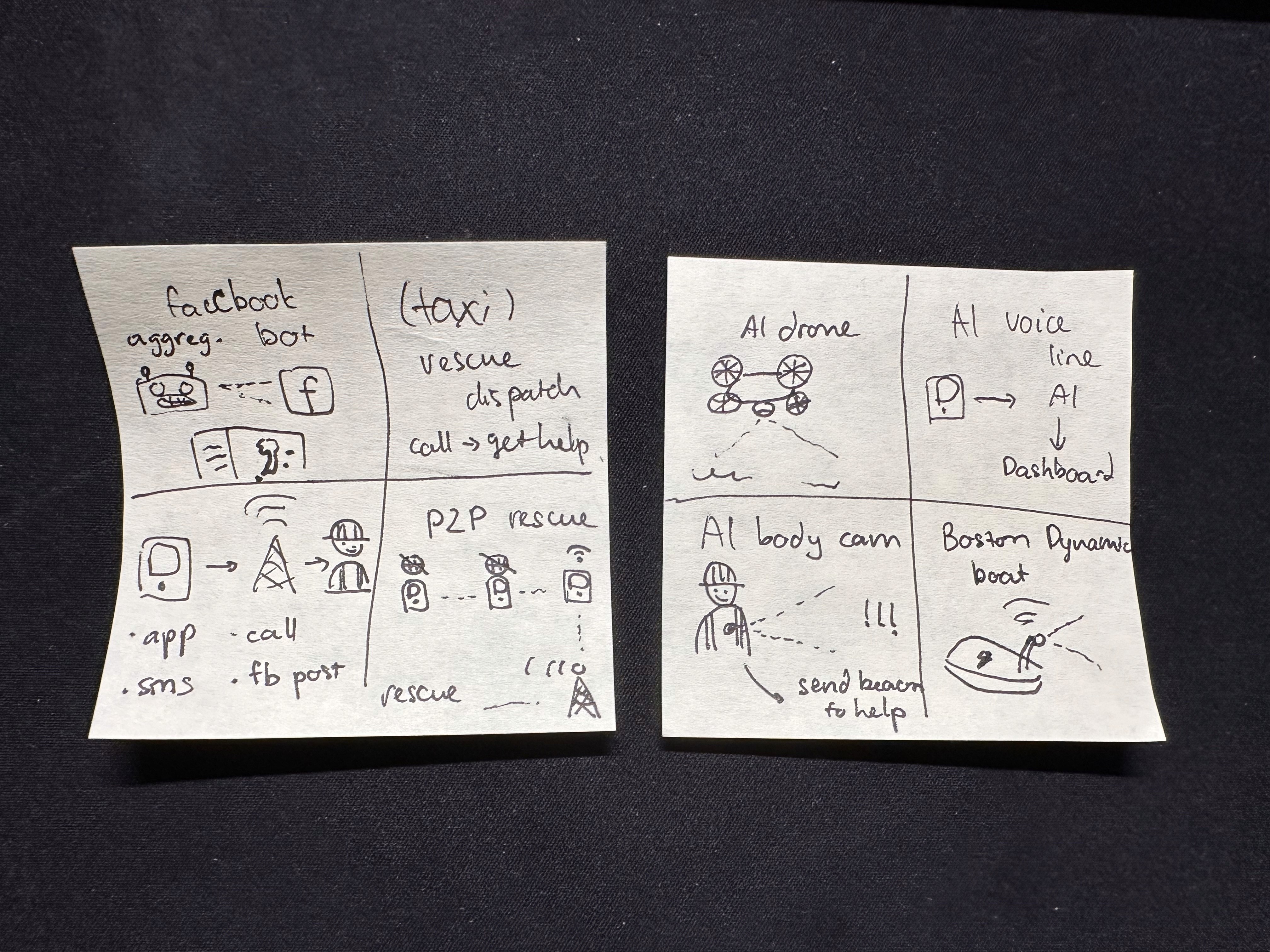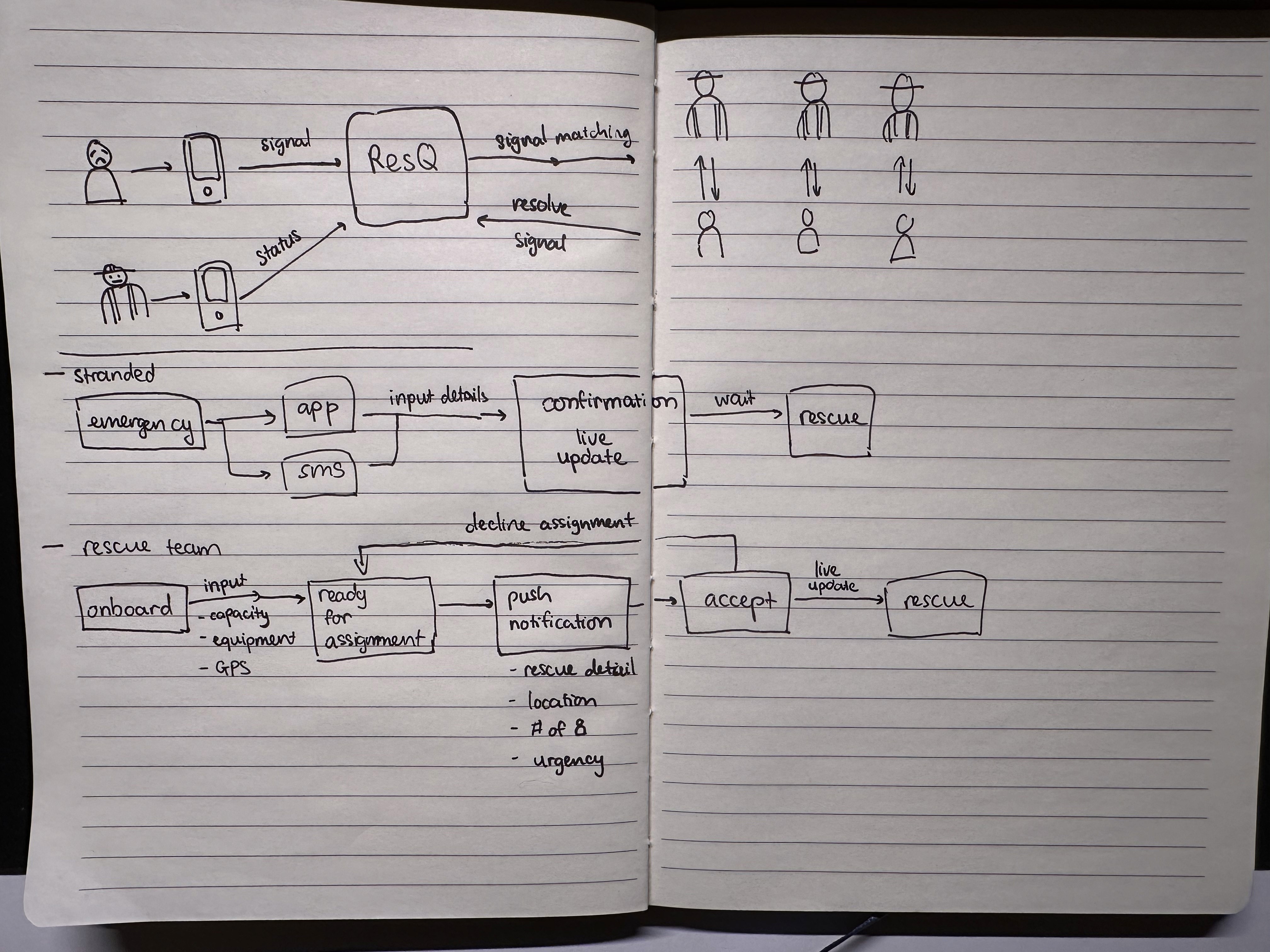 That's when ResQ was born: a web platform where anyone stranded during a disaster can send an SOS, get matched with the nearest available rescuer with the right equipment in seconds, and receive help within 8-15 minutes. With a concrete idea in mind, I picked up my scratchpad.